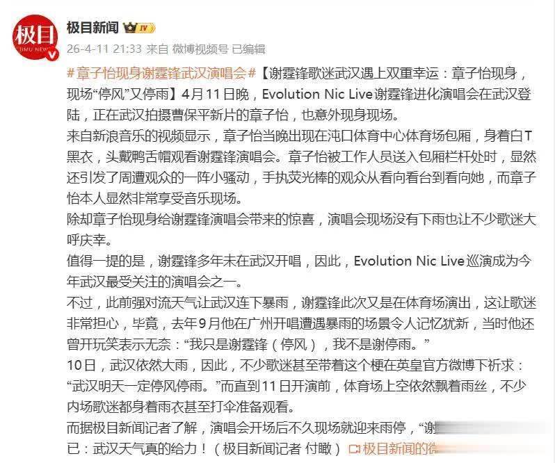 除了章子怡带来的惊喜,当晚的天气也让所有歌迷大呼庆幸。要晓得,谢霆锋多年未在武汉开唱,这次体育场巡演本就是当地今年备受关注的演唱会之一。但开唱前,强对流天气致使武汉连下暴雨,这不禁让人捏了把汗——毕竟去年9月他在广州的演唱会就曾遭遇暴雨,当时谢霆锋还曾开玩笑自嘲:“我只是谢霆锋(停风),我不是谢停雨。”
